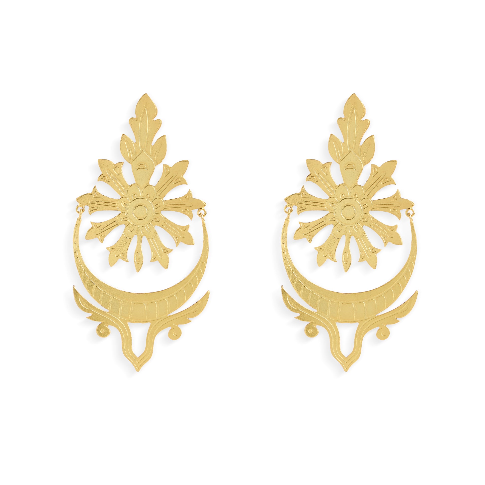 Hand-carved in radiant gold, the intricate floral motif reflects not just beauty but boldness. Whether worn for a black-tie gala or an intimate celebration, these earrings bloom with quiet opulence and cultural depth.