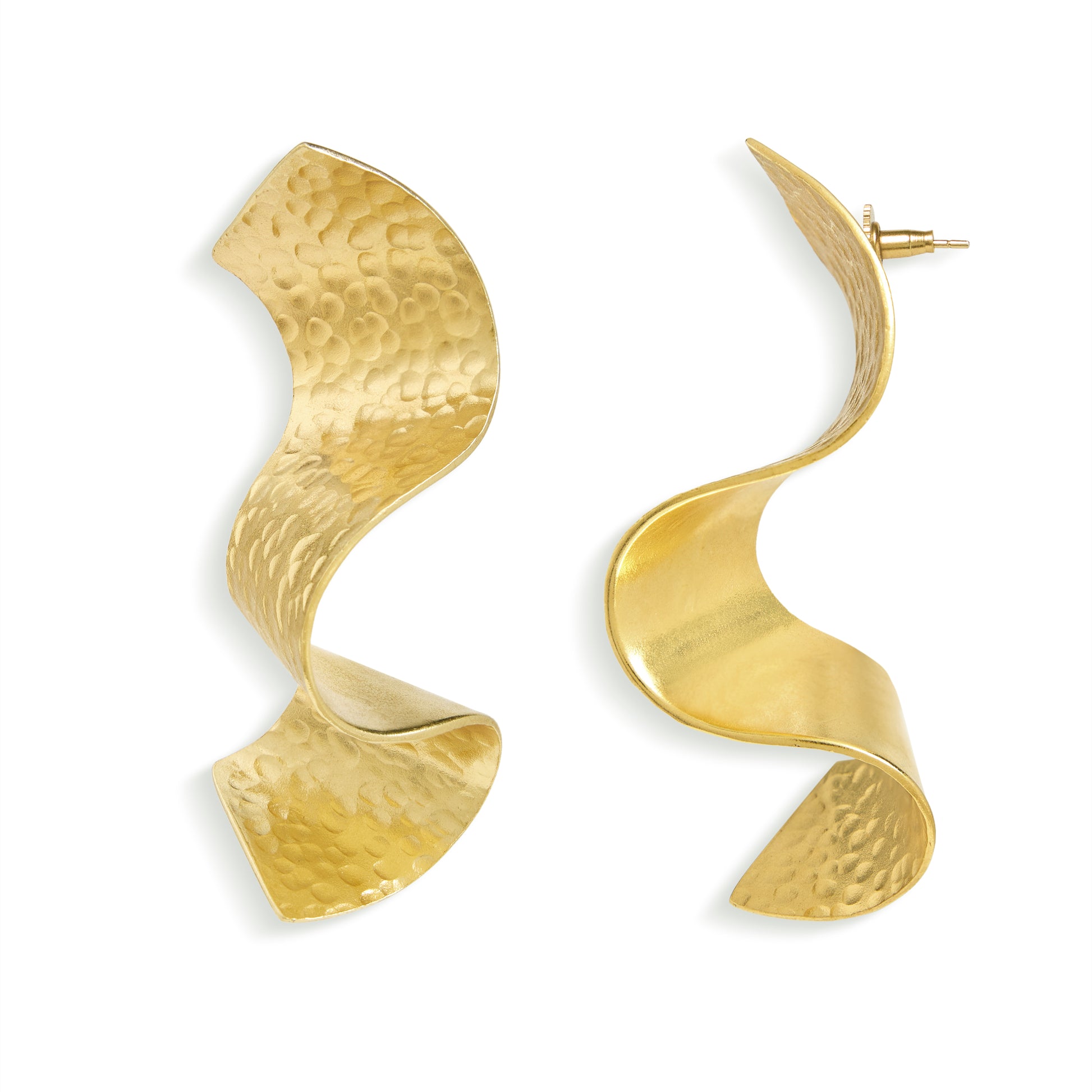These elongated hammered gold earrings bring sculpture to life—fluid, refined, and unmistakably regal. Crafted by hand in Nepal, their swirl design reflects movement, depth, and a modern aesthetic rooted in tradition.